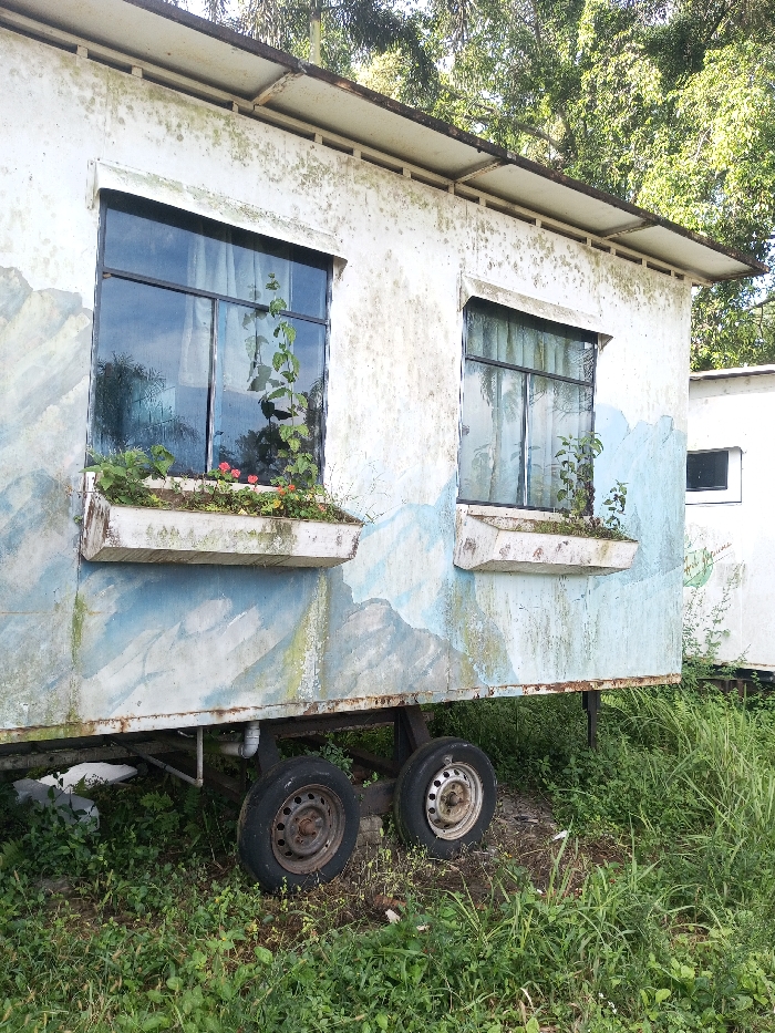 A weathered, white mobile structure with two windows, each adorned with a flower box, rests atop a trailer. A mural of mountains decorates the lower section. Rust streaks the surface, showing its age. Tall grass and weeds surround the trailer wheels, merging with the neglected scene. Part of another white structure is visible in the background.
