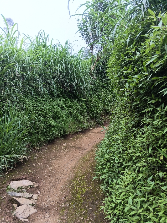 A narrow, unpaved dirt path winds through dense green vegetation in Pinnwe, Myanmar (Burma)