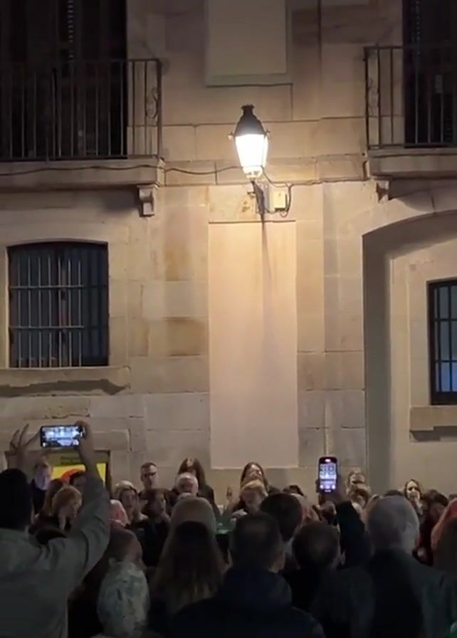 A low-angle shot reveals a crowd gathered outside a stone building at night. The building features barred windows and small balconies. A lit lamp affixed to the wall illuminates the crowd. Many individuals are holding up their smartphones, seemingly recording or taking pictures. The overall atmosphere suggests a public event or gathering, possibly related to the building or the activity taking place.
