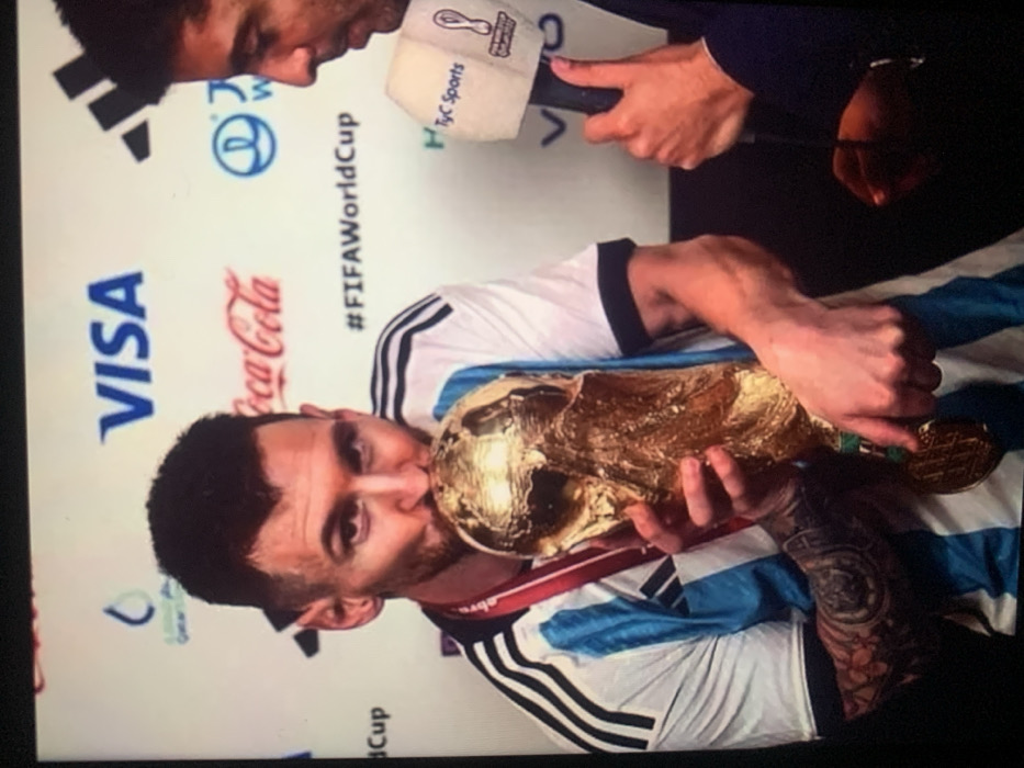The image depicts a celebratory scene featuring two males against a white backdrop filled with sponsor logos. On the left, Lionel Messi, with dark hair and a beard, is seen from the chest up, wearing an Argentina national football team jersey with blue and white stripes and a black collar/sleeve trim. A red lanyard with a gold medal hangs around his neck. He holds the gold FIFA World Cup trophy with both hands and is kissing its upper sphere. Tattoos are visible on his left forearm. On the right, partially visible from the nose down, is a male interviewer with dark hair, wearing a dark suit. He holds a white microphone with "TyC Sports" and the FIFA World Cup Qatar 2022 logo emblazoned on it, positioned towards Messi. The background displays prominent logos including VISA, Coca-Cola, Adidas, a Qatar Airways emblem, and the hashtag "#FIFAWorldCup". This scene takes place in the city of Kafr Sousa Municipality, Syria.