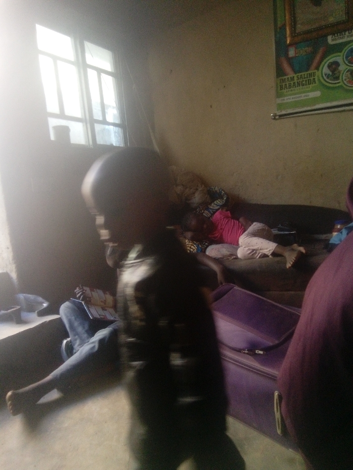A dimly lit interior scene shows a young child partially blurred in the foreground. Another child rests on a dark sofa in the background, wearing a pink shirt and light-colored pants. Adjacent to the sofa, a partially visible person in jeans sits with a book. A purple suitcase rests near another person wearing a purple jacket. A window provides bright light, while a poster hangs on the wall, adding to the interior's character.
