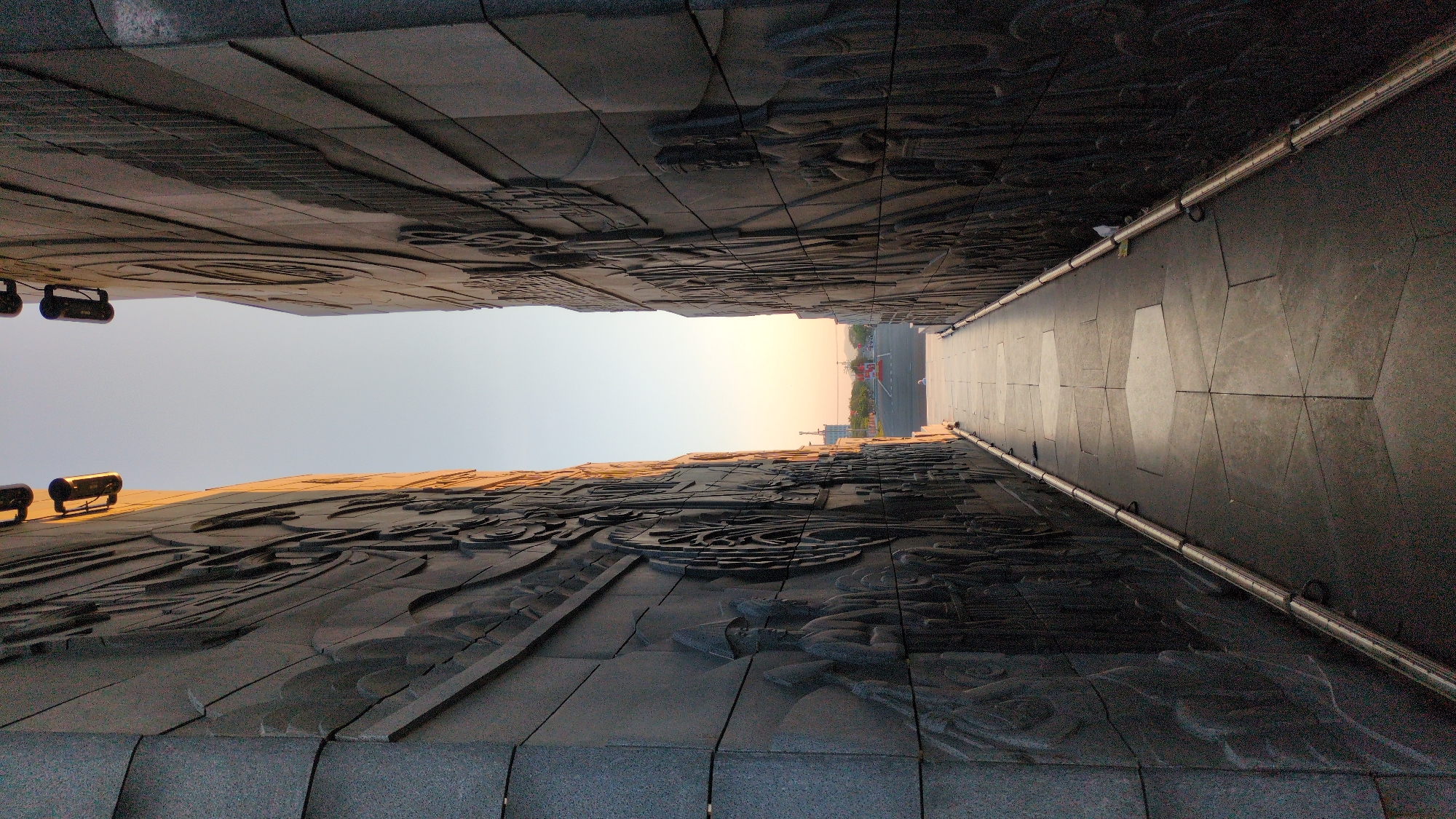 The image depicts a long, narrow walkway or tunnel in Tuy Hòa, Vietnam, lined with large, grey stone walls adorned with intricate relief carvings. The walkway is constructed of hexagonal tiles, and runs towards an opening where a road, buildings, and a distant skyline are visible, bathed in a soft, orange sunset or sunrise glow. Overhead lighting fixtures are mounted on the walls. The image is taken from a low angle, looking upward through the passage, and appears to be vertically oriented.