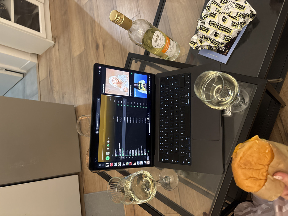 The scene depicts an indoor setting, identified as a residential space in Asnières-sur-Seine, France, viewed from an elevated perspective. A dark gray Apple MacBook laptop with an active screen displaying the Spotify music application is centrally positioned on a dark-framed glass-top table. The Spotify screen shows a playlist featuring "Happier Than Ever" and "Billie Bossa Nova" by Billie Eilish. To the left of the laptop are two stemmed wine glasses, both containing a light-yellow liquid consistent with white wine; one is nearly full, the other approximately half-full. A third empty, clear glass is situated further back. To the right of the laptop, an uncorked bottle of "LES ORMES CAMBRAN MUSCAT MOELLEUX" white wine stands upright. Adjacent to the wine bottle, a crumpled paper wrapper displaying "BURGER & FRIES" branding is present. In the lower-left foreground, a person's left hand, with painted fingernails, holds a hamburger or sandwich wrapped in brown paper. The immediate environment includes a light-colored wooden floor and, in the background, a light-toned appliance and a white door frame. The overall scene suggests an individual is relaxing, listening to music, drinking wine, and consuming a fast-food meal.
