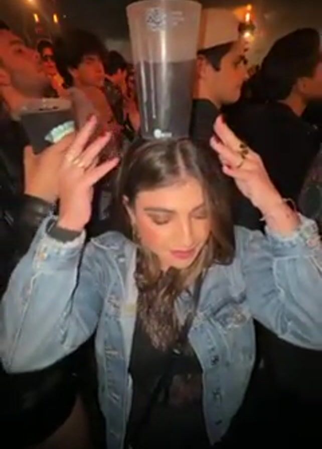 A young woman with brown hair dances at what appears to be a crowded concert or festival, with a large plastic cup filled with a dark liquid balanced on her head. She wears a dark top with lace and a light-wash denim jacket. Her hands are held out to the sides for balance, and she’s wearing several rings. Around her, other attendees are visible; some hold cups, and their faces are partially visible. The scene is lit by concert lighting, which casts colorful glows around the area. The ground appears uneven, and the environment seems lively and energetic.