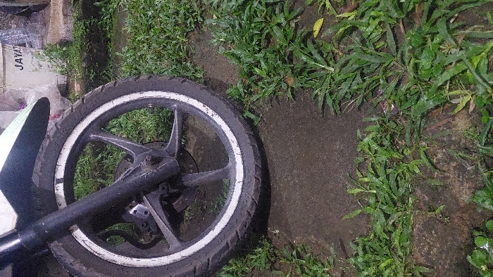 front tire of a motorcycle parked on a dirt path. The tire has a white rim and is partially obscured by green foliage. The motorcycle is parked near a concrete wall with the word "JAYAN" written on it. The scene is located in Kecamatan Babakan Madang, Indonesia, at the coordinates -6.579 latitude and 106.886 longitude. There are no people or other objects visible in the image.