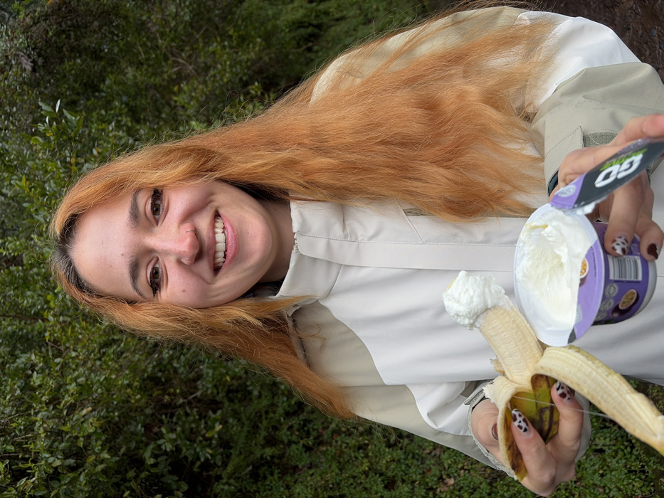 A young adult female with long, wavy reddish-blonde hair and a silver nose piercing smiles directly at the camera. She wears a two-tone jacket, light beige and off-white, with a high collar and zipper. In her left hand, she holds a partially peeled banana, the exposed end topped with a white creamy substance, possibly yogurt. Her right hand holds an open purple and white yogurt cup, revealing white yogurt inside. The cup's lid fragment shows "GO" branding and a passion fruit graphic. Both hands display fingernails painted with a brown and white cow-print design. The background consists of dense, dark green foliage, indicative of an outdoor, natural environment in Santana, Portugal.