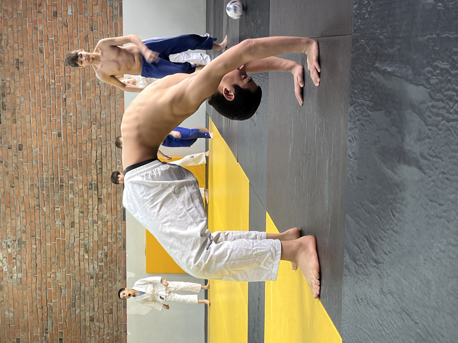 A group of young athletes in a training area. One athlete, shirtless with white pants, performs a backbend, hands pressed against a wall. Others, wearing judo uniforms, are visible in the background, including one shirtless and one in a white uniform. The training area features a brick wall and a mat with yellow and gray sections. A soccer ball sits on the gray mat in the top right corner.