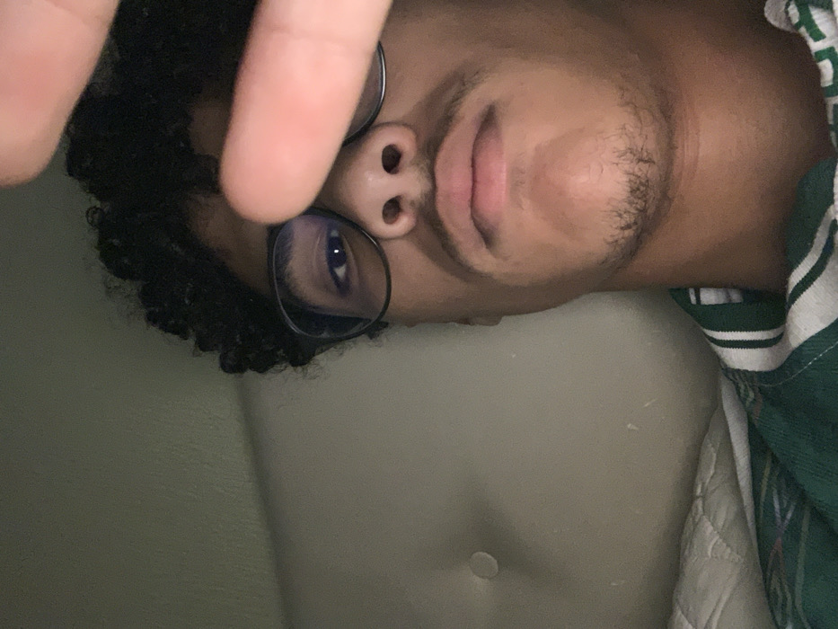 A close-up, dimly lit image depicts a single male individual indoors. The specific location within Casablanca, Morocco, cannot be determined from the visual information; the background suggests a residential or private interior space. The individual has dark skin, dark curly hair, and wears dark-framed eyeglasses. He possesses a mustache and a patchy goatee. One finger, positioned horizontally, partially obscures the upper central portion of his face, covering the forehead and upper left eye. He is wearing a green polo shirt with white striped collar details. Behind him, a light-colored, possibly beige or pale green, padded headboard with a circular button or tuft is visible on the left side. Below this, a white quilted texture, possibly bedding, is present.