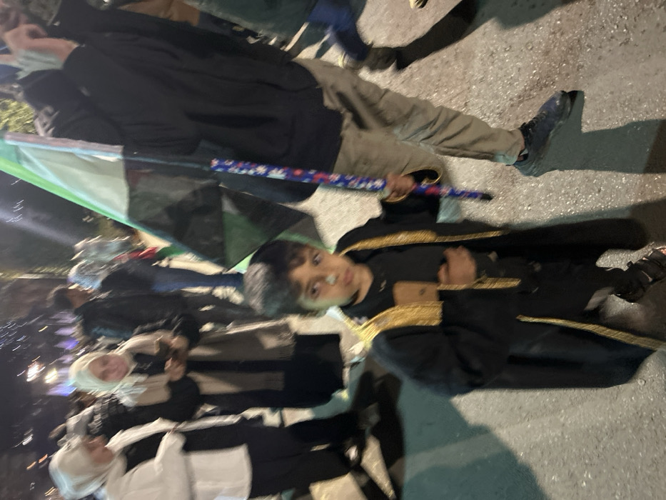 The image depicts a nighttime street scene within Al-Qanawat Municipality, Syria, featuring a gathering of individuals. In the foreground, a young male child stands centrally, looking directly at the camera. He wears a black robe with gold-colored trim over dark clothing and dark sandals. He holds a patterned pole, colored with blue and red sections, in his left hand, and a light-colored rectangular object, possibly a mobile phone, against his chest with his right hand. To the child's immediate left (viewer's right), an adult's legs and lower torso are visible, wearing light trousers and dark sneakers, holding a flag. The flag displays black, white, and green horizontal stripes with a red triangle on the hoist side, consistent with the Palestinian flag. To the child's immediate right (viewer's left), an adult female in a white hijab and white jacket stands, looking towards her left. Behind her, another adult female in a light-colored hijab is focused on a mobile phone held in both hands. The background is blurred, showing additional indistinct figures and illuminated architectural elements, indicative of an urban setting under artificial lighting. The ground is a dark paved surface.