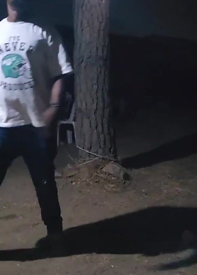 man in a baseball cap, white t-shirt, and jeans standing outside at night. He seems to be at a gathering, as another man walks by in the background and there are white plastic chairs visible. Two red plastic cups are lying on the ground. The lighting is dim, with a light source coming from above, casting a shadow of the man and a nearby tree. The ground appears to be dirt or dry grass. The video ends with the man throwing something up into the air, possibly a cup.