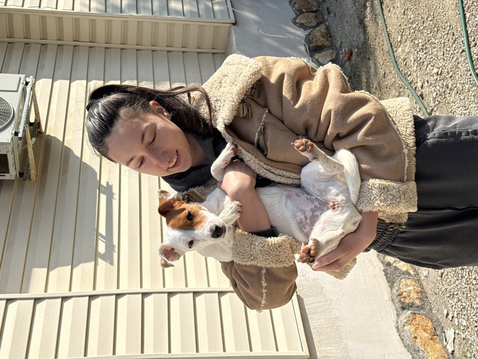 The image captures an outdoor scene in Galabovtsi, Bulgaria, featuring one female and one dog. The female, positioned centrally, has dark hair pulled into a high ponytail. She wears a light brown suede-like jacket with cream-colored shearling lining, a grey hooded sweatshirt, and dark grey sweatpants. Her head is tilted slightly down and to her left, and she displays a closed-mouth smile. She is holding a small, white dog with brown patches on its head, consistent with a terrier-type breed, in her arms. The dog is positioned on its back, exposing its abdomen, and looks directly towards the viewer. The background consists of a building wall with light beige horizontal siding. An external air conditioning unit is mounted high on the wall, partially visible in the upper right. Below the siding, a foundation constructed of rough-hewn stones is visible. The ground is covered with gravel. A dark green garden hose lies partially visible on the ground in the lower right portion of the frame. The scene is illuminated by direct sunlight, casting distinct shadows on the building's siding.