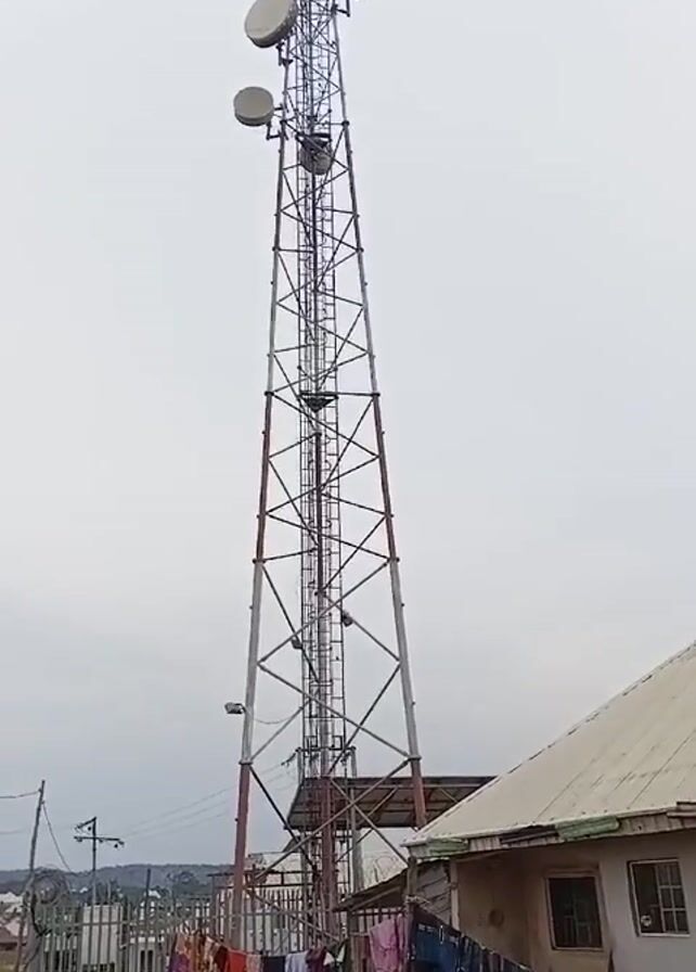 tall communication tower against a cloudy sky. The tower is a metal structure with a series of microwave dish antennas attached to it. A ladder runs up the center of the tower. The base of the tower is enclosed by a metal fence. In the foreground, laundry is hung on a clothesline between two metal posts, and a small building with a corrugated metal roof is visible. A motorcycle is parked next to the fence. In the background, there are other buildings and structures visible in the distance.
