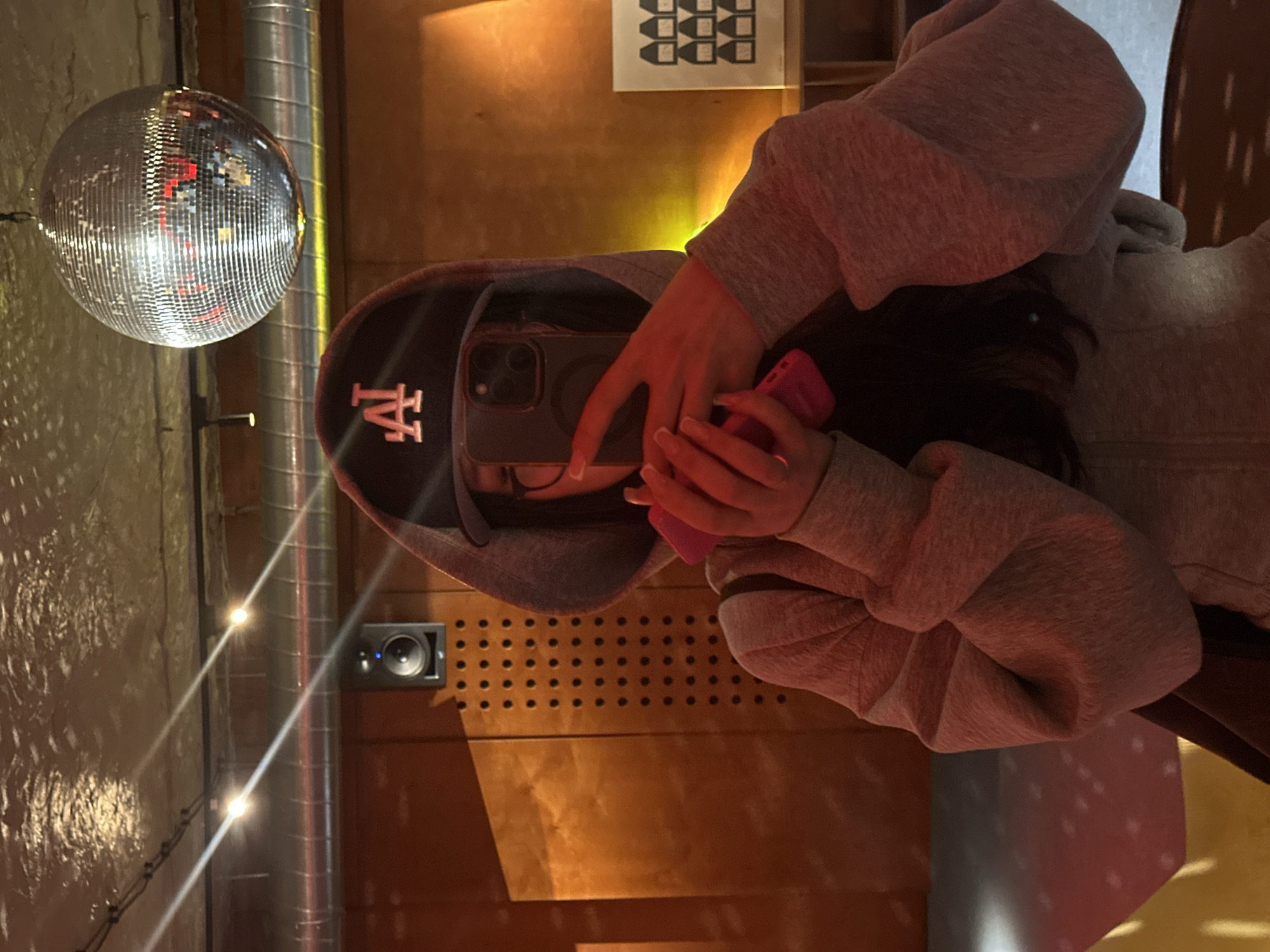 person in a gray hooded sweatshirt and a black LA baseball cap, holding a smartphone in front of their face. There is a disco ball hanging nearby. The background includes a speaker mounted on a wooden wall and a silver ventilation pipe. The location seems to be a bar or entertainment venue with warm, ambient lighting. There's a framed picture on the wall, with a design of stacked items. The location within Yerevan, Armenia, cannot be determined from the image alone.