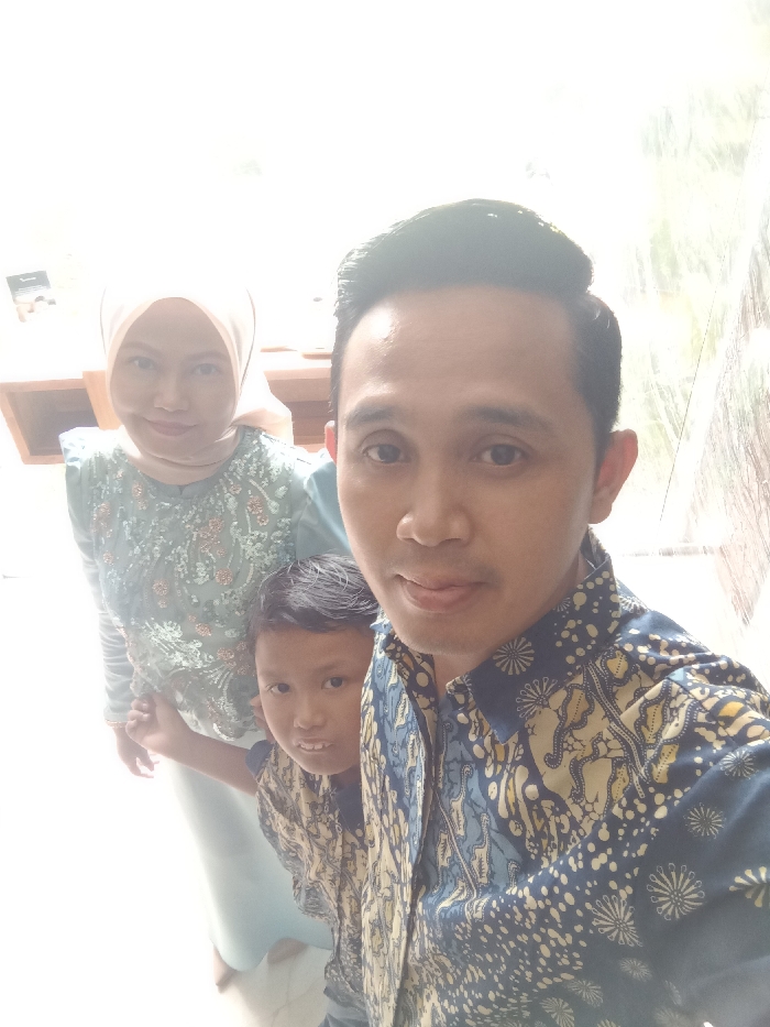 A selfie shows a family of three. A woman in a light hijab and pastel-colored, floral-patterned dress smiles at the camera. Beside and slightly in front of her is a young boy, also looking at the camera with a neutral expression, wearing a patterned shirt. A man, presumably the father, holds the camera. He also wears a patterned shirt similar to the boy's, and his hair is neatly styled. The background appears to be an interior space with bright lighting.
