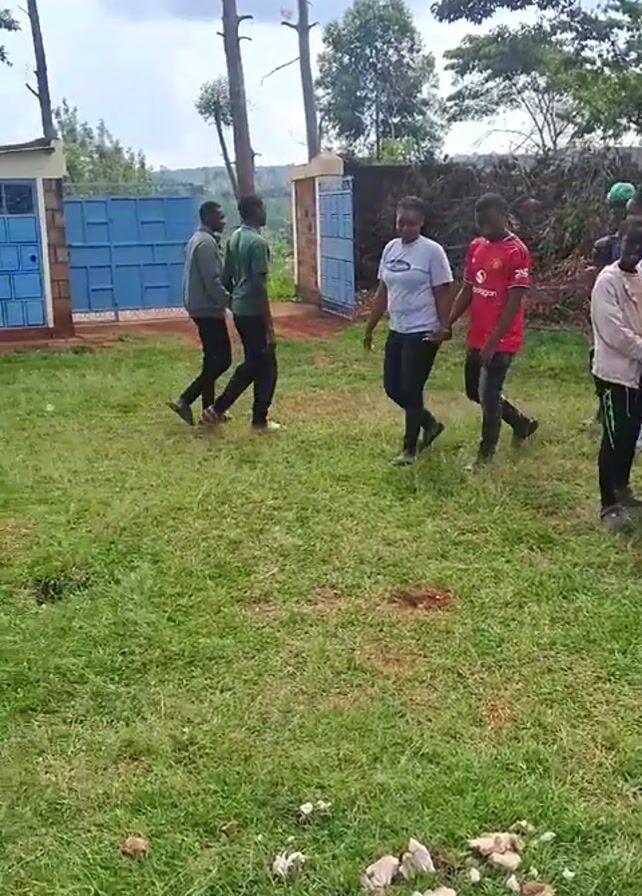 A group of about ten people of various ages walk through a grassy yard in a staggered cluster. They are dressed casually. A low brick wall, a gate and trees define the perimeter of the yard. In the foreground, there is a patch of light-colored debris. The sky is overcast.