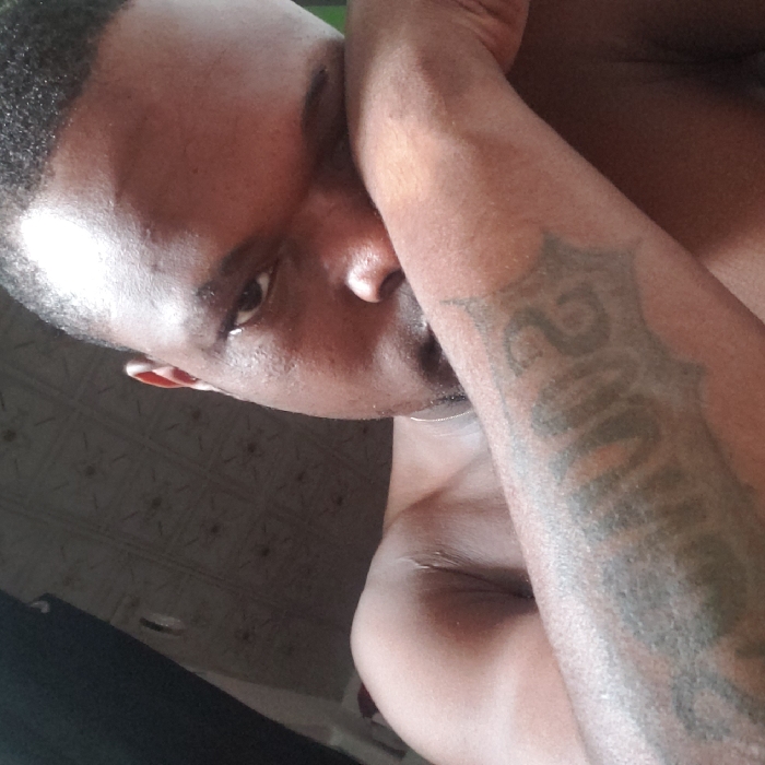 An adult male with dark skin and short dark hair is depicted in a close-up, chest-up shot within an indoor setting in Okpanam, Nigeria. He is shirtless, wearing a thin silver-colored chain around his neck. His left arm is bent, and the forearm is positioned horizontally across the lower half of his face, obscuring his mouth and partially covering his right eye. His visible left eye maintains a direct gaze towards the camera. A distinct tattoo of stylized dark lettering, appearing to spell "SWAG" or similar text, is visible on the inner forearm of his left arm. The background reveals a ceiling with white or light-colored textured ceiling tiles.