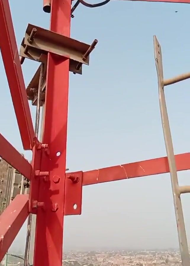 The camera pans upwards on a red steel lattice tower, possibly a communications or transmission tower, against a clear, light-blue sky