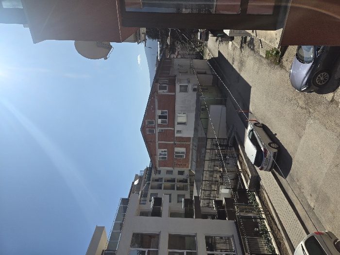 The image displays an elevated view of a residential street in Sofia, Bulgaria, on a clear, sunny day with visible sun glare in the upper right quadrant of the blue sky. On the left, a modern, multi-story white building with multiple balconies featuring glass railings and dark-framed windows occupies the foreground. Its property is delineated by a paved sidewalk and a black metal fence. In the center, an older four-story building stands prominently. This structure features exposed red brickwork on its gabled top floor with multiple windows, while its lower three floors are painted white. A fenced enclosure, possibly for utilities or parking, is situated at its base. Utility lines are suspended across the street, extending from right to left. On the right side of the frame, a partial view of a reddish-brown building is visible, featuring a large, off-white satellite dish mounted on its exterior. The asphalt street contains several parked vehicles. A silver hatchback is positioned on the left side of the street, oriented away from the viewer. A dark grey sedan is partially visible in the bottom right foreground. A light-colored minivan is partially visible in the bottom left foreground. Another vehicle is discernible further down the street in the distance. No individuals are present in the scene. A faint mountain range is visible on the distant horizon, consistent with the Vitosha mountain range bordering Sofia.