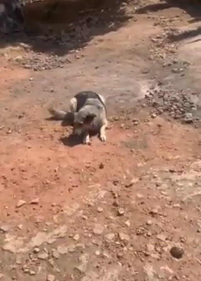 medium-sized dog, with gray, black, and white fur, lying down in a dirt and gravel area and scratching its head. The ground is primarily red dirt and gravel, with larger stones scattered around. In the background, there's a partially constructed building made of concrete blocks, suggesting an ongoing construction site. The lighting appears to be bright and sunny, casting shadows in the scene.