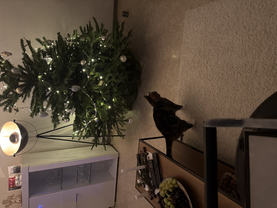 A Christmas tree decorated with lights and ornaments stands beside a cabinet and a floor lamp. A brown tabby cat stands on a console table, seemingly gazing up at the tree. A dish of grapes and other items are visible on the table. A beige rug covers the floor. The image is dimly lit.