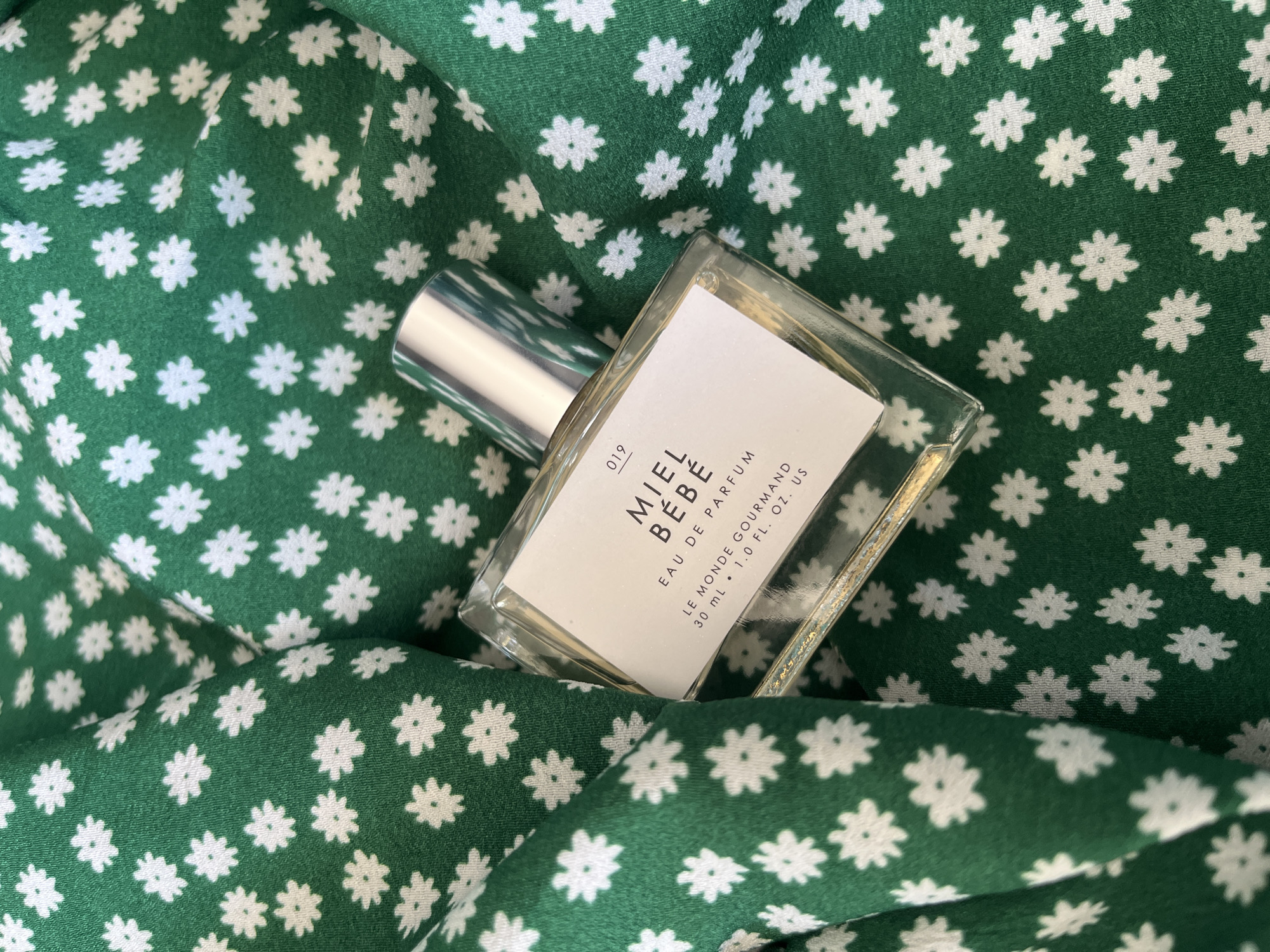 bottle of "Miel Bébé" eau de parfum resting on a green fabric with a pattern of small white flowers. The perfume bottle is rectangular with a silver cap and a white label with black text. The text on the label reads: "019 MIEL BÉBÉ EAU DE PARFUM LE MONDE GOURMAND 30 mL 1.0 FL. OZ. US." The fabric is draped with folds and creases, obscuring part of the bottle. The scene does not appear to be in Sofia, Bulgaria, as there are no elements that suggest the location.