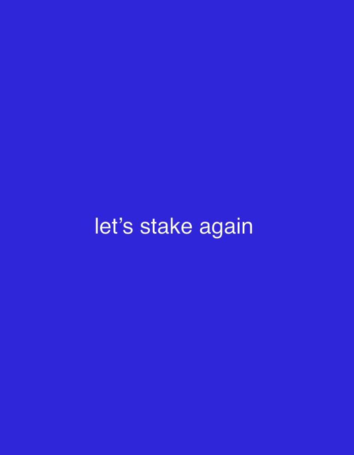 The image displays a solid royal blue background. Centrally positioned, white, sans-serif text reads "let's stake again". The scene consists exclusively of this graphic text on a uniform color field. No people, identifiable subjects, distinct objects, actions, or interactions are visually depicted. The environment is an abstract, monochromatic backdrop. The specified location is Oltiariq, Uzbekistan.