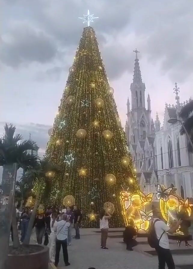 large, decorated Christmas tree in an outdoor public area. The tree is adorned with gold-colored lights, large baubles, and star decorations, and it is topped with a bright star. Several people are walking around and taking pictures, suggesting a festive or touristy atmosphere. To the right of the Christmas tree, there is a tall, white church with a pointed spire. The sky is overcast, indicating it is either dusk or dawn. The ground is paved with patterned stone. There are additional decorations around the base of the tree, including illuminated figures, possibly butterflies. There are palm trees and other plants present as well.