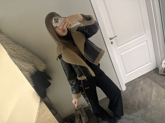 The image displays an indoor mirror selfie. The specific location within Ruse, Bulgaria, is indeterminate from visual evidence, appearing as a generic interior space, possibly a hallway or entrance area. A single female individual, estimated to be in her late teens or early twenties, is positioned in front of a rectangular mirror. She holds a silver-colored smartphone, adorned with a reflective, jeweled case, which obscures most of her face. Her long, straight, light brown hair is visible. Her attire consists of a black turtleneck, a black bomber-style jacket with a tan shearling-like collar and lining, and black pants with a white side stripe featuring the 'GUESS' logo on the left leg. Her feet are clad in dark footwear. The immediate environment features light-colored walls and a floor composed of large, light grey rectangular tiles. To the right of the individual, a white paneled interior door with a silver handle is visible. A white plastic bag, displaying a yellow and blue logo consistent with LIDL branding, rests on the tiled floor adjacent to the door. To the left, the mirror reflects a portion of a light-colored, fluffy garment or textile hanging in the unseen space behind the camera.