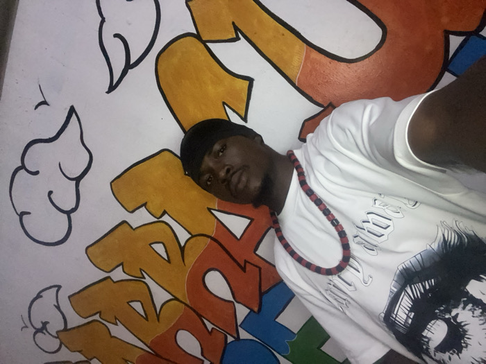 A man with dark skin, a black head covering, and a red and black beaded necklace poses diagonally against a graffiti-covered wall. The wall features colorful, cartoonish letters in yellow, orange, and blue, with outlined cloud-like shapes in the upper left corner. The man wears a white t-shirt with a black and white graphic on the lower right. He is looking directly at the camera with a slightly tilted head.