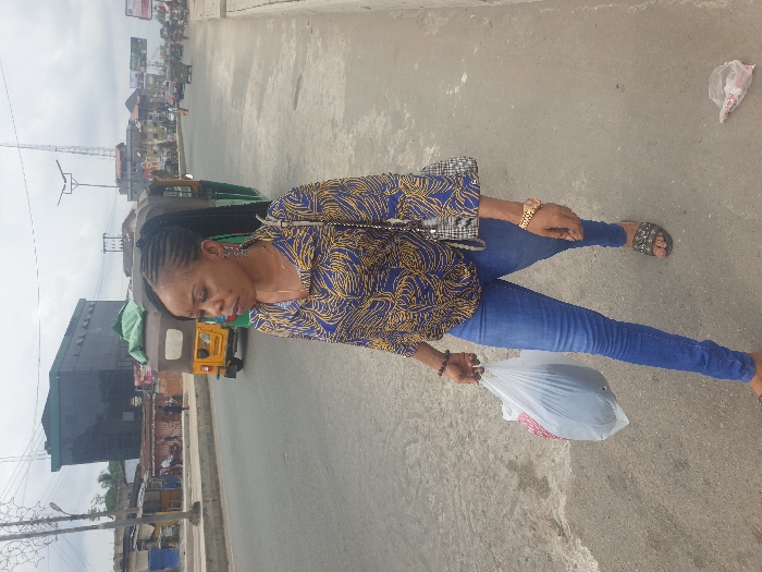 An outdoor urban scene in Aba, Abia, Nigeria, depicts a woman walking on a grey concrete sidewalk on an overcast day