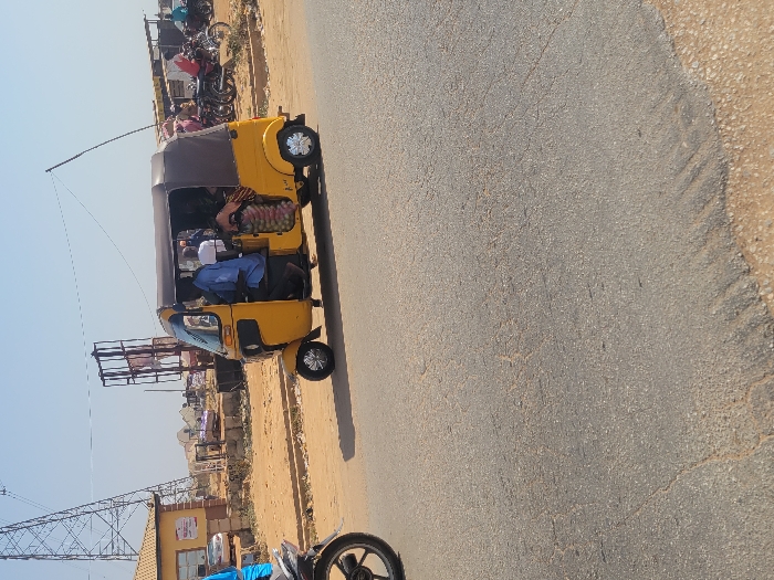 This image captures a street scene in the city of Kwamba, Nigeria. A yellow and brown three-wheeled auto-rickshaw occupies the center-right of the frame, positioned on a grey asphalt road exhibiting surface cracks and wear. The auto-rickshaw contains a driver in blue attire and several passengers, with a large bag of red produce visible on its right side. To the far left in the foreground, a portion of a motorcycle's front wheel and tire is visible. The background on the right features a dirt shoulder populated by multiple parked motorcycles and several individuals. Behind them, various single-story structures with corrugated metal roofs are present. The left background reveals a light-colored, single-story building with a red and white sign on its facade, a silver car parked nearby, and a tall metal electricity transmission tower. Further into the distance, additional buildings and a large, rusty metal framework structure are visible under a clear, bright sky.