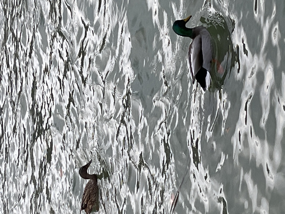 Two birds, likely ducks, are seen on the water. One, a male mallard with a green head and grey body, is positioned in the upper right. The other, smaller and brown, is near the bottom left. The water's surface is textured with light and dark lines, creating a rippled effect. The image's composition and the water's reflections add an abstract quality to the scene.