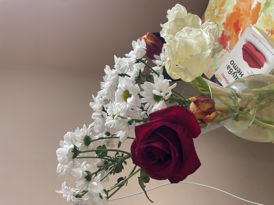 The image displays an indoor still life scene in Blagoevgrad, Bulgaria, featuring a bouquet of mixed flowers arranged in a clear glass vase. The bouquet predominantly consists of multiple white daisies with prominent yellow centers, alongside a single deep red rose situated on the left. Two orange and red tulips are also visible, one partially wilted and positioned lower in the vase, and another further back. A large, pale yellow or cream-colored flower with soft, crinkled petals, potentially a wilting peony or poppy, is positioned on the right side of the arrangement. The transparent glass vase, containing clear water, rests on a surface covered by a colorful fabric or mat featuring abstract or floral patterns in shades of orange, green, and yellow. To the right of the vase, a white-covered book lies flat, displaying Cyrillic text, including "Чувствам Нещо," and a graphic of red lips. The background consists of a plain, light peach-colored wall. A thin white cable runs vertically along the left edge of the frame. The scene is illuminated by soft, ambient light.