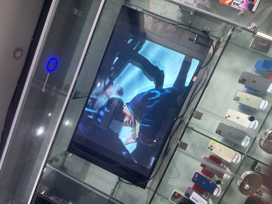 This image captures the interior of a retail establishment, specifically a mobile phone store, located in Ikeja, Nigeria. A flat-screen television, branded "LG," is mounted or placed centrally, displaying a video or still image of an individual from the chest up. This person wears a dark blue garment and a prominent, multi-layered gold-colored chain around their neck, set against a background featuring shades of dark and light blue. Below the television, a series of clear glass display cases are arranged, containing numerous smartphones. These devices are primarily Apple iPhones, including various models and colors such as gold, grey, white, blue, and red, each standing upright on individual white display stands. Reflections of overhead recessed spotlights and a circular blue ceiling light are visible on the glass surfaces of the display cases and the area above the television. No other individuals are present within the captured frame.