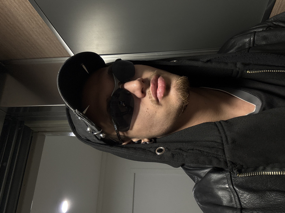 The scene depicts a close-up portrait of an individual inside a building located in Asnières-sur-Seine, France. The subject, appearing to be a young male, is seen from the chest up, facing slightly right with a neutral expression and lips slightly parted. He wears a black baseball cap adorned with four silver-colored studs or spikes on the brim, dark sunglasses (Bolle brand visible on the left temple), a black hooded sweatshirt with frayed edges and a silver grommet on the left side of the hood, and a black leather jacket with a partially visible zipper. A gray undershirt is visible beneath the hoodie. A light brown goatee and mustache are present. A silver-colored hoop earring is visible in the subject's left ear. The background on the left consists of a white wall with a recessed light fixture and a metallic vertical beam. On the right, dark gray or black paneling is visible, partially obscured by a diagonally oriented wooden-textured panel above. The reflections in the sunglasses suggest an indoor, possibly well-lit, environment.