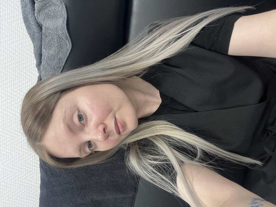 A young adult female is depicted in an indoor setting, specifically identified as being in the city of Chaikovsky, Russia. She possesses fair skin, light-colored eyes, and long hair, characterized by natural light brown roots transitioning into bleached ash blonde or silver-blonde mid-lengths and ends. Her face appears free of makeup, displaying a natural skin tone with subtle redness on the cheeks. She maintains direct eye contact with the camera, exhibiting a neutral expression. The subject is dressed in a black short-sleeved t-shirt layered beneath a black V-neck wrap-style smock or uniform top, cinched at the waist. A faint blue tattoo is visible on her left forearm. Behind her, a dark, padded backrest, consistent with a chair or sofa, is present. Two towels are draped over this backrest: one dark gray situated on the left, and a lighter gray one on the right. A light-colored, textured wall is visible in the upper left portion of the background.