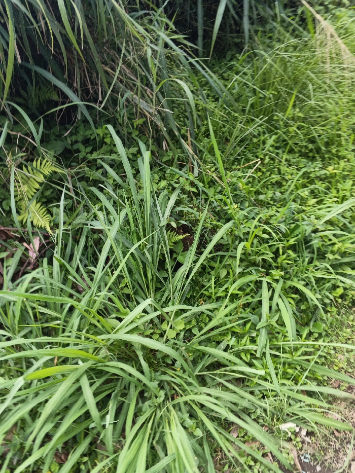 The scene, located in the city of Koipa, Papua New Guinea, depicts a dense, natural expanse of green vegetation. The foreground and midground are primarily composed of various types of grasses, characterized by long, narrow, bright to medium green blades, forming thick clumps. Interspersed throughout and receding into the background are numerous smaller broad-leafed plants and darker green foliage. In the upper left quadrant, several light green fern fronds are visible amidst the other plant life. The background consists of a dense, undifferentiated mass of green vegetation, suggesting a wild or overgrown area. No human figures, animals, or man-made objects are present in the frame. The lighting is uniform, indicating either an overcast condition or a shaded environment.