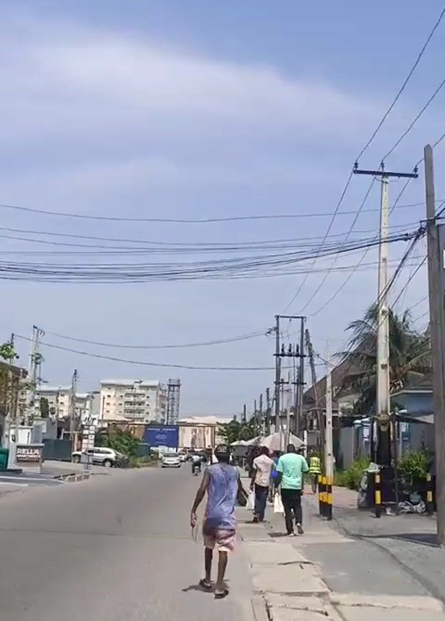 A vertical video shows a man in a blue shirt and cap walking on a sidewalk. To the right, a city street is visible with several people walking. There are buildings and power lines in the background.