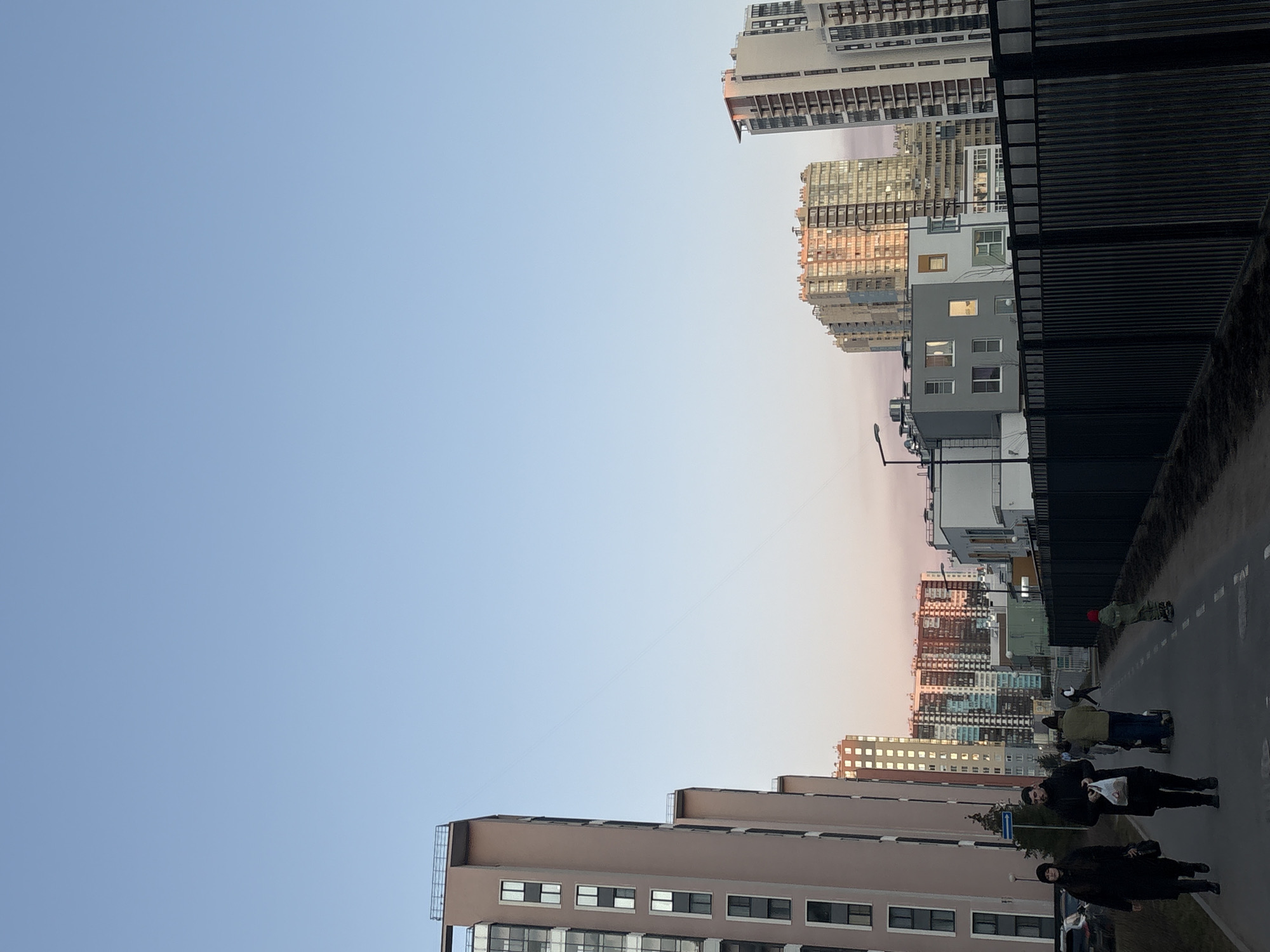 An urban street scene in the Nevsky District of Saint Petersburg, Russia, captured during either sunrise or sunset, evidenced by the light blue sky transitioning to pink and orange hues near the horizon. On the left side of the frame, a row of modern, multi-story residential buildings with light brown/beige facades and dark-framed rectangular windows extends into the background. A paved pathway runs parallel to these buildings. In the foreground on this path, a woman in a dark coat and hat walks towards the viewer, carrying a dark bag. Beside her, a man in a dark coat walks towards the viewer, holding a white plastic bag. Further along the path, an adult dressed in a light olive-green jacket and dark hat pushes a dark-colored stroller. A child, wearing a red hat and an olive-green outfit, rides a scooter away from the viewer on the same path. To the right of the paved path, a dark, vertical-slatted metal fence runs into the distance, bordering an unpaved strip of ground. Beyond the fence, various urban structures are visible. In the mid-ground, a contemporary building with grey and white facades and multiple rectangular windows is present. In the background, numerous high-rise residential buildings display diverse architectural styles, with several reflecting the warm, reddish light from the low sun. Streetlights are positioned along the fence line, and a blue directional sign is visible near the buildings on the left. A faint, thin line, possibly a utility cable, traverses the upper part of the sky from left to right.