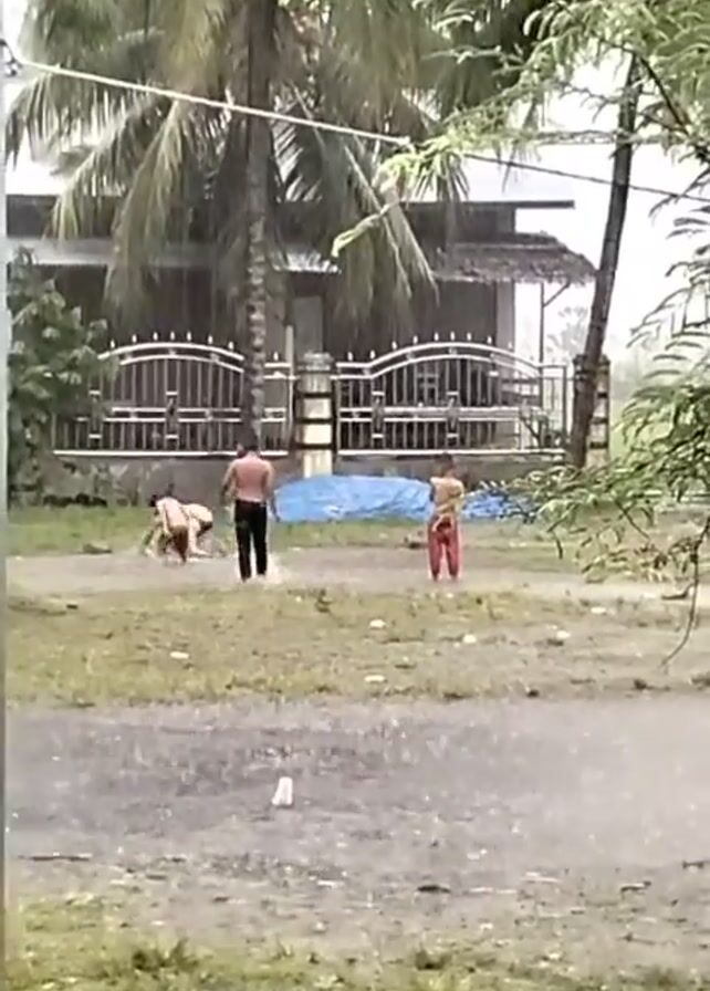 three people playing in a heavy rain on a grassy area in front of a house. Two of them appear to be shirtless. One person, wearing dark pants, is walking while the other two are crouching on the ground. A blue tarp is laid out on the grass. The house is visible behind a gate and a large palm tree. The ground is wet and water is splashing as the people move.