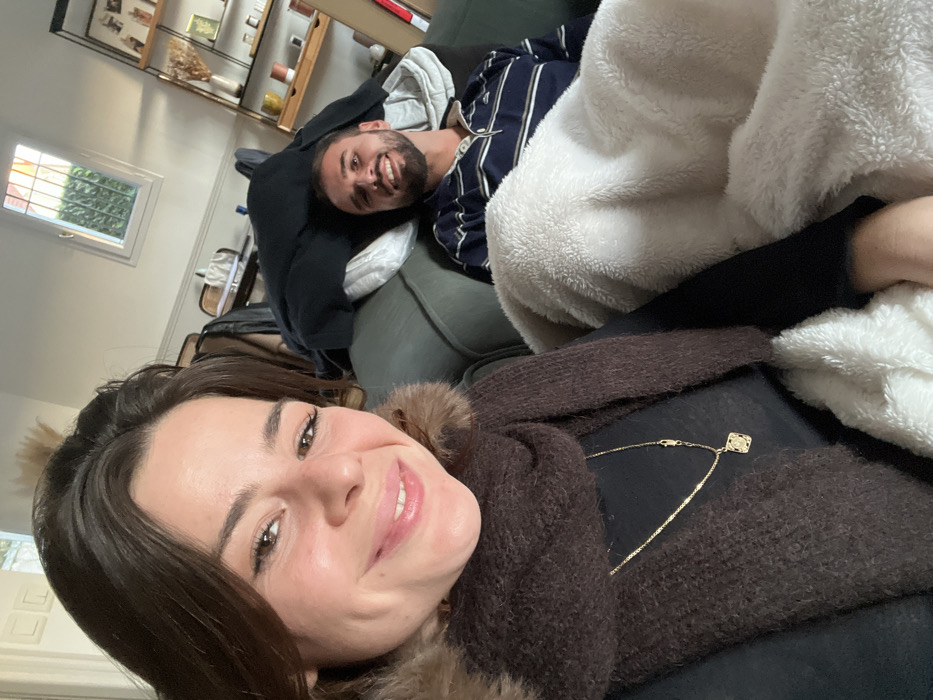The image depicts two individuals indoors in what appears to be a living room setting, located in Rueil-Malmaison, France. In the foreground, a female with dark brown hair and light skin is visible, smiling directly at the camera. She is wearing a black long-sleeved top, a dark brown fuzzy scarf, and a gold chain necklace with a square, ornate pendant. Her collar appears to be lined with light brown fur. In the background, to the right of the female, a male subject is reclining on a dark green or gray sofa. He has short dark hair and a beard, and is also smiling towards the camera. He is dressed in a blue and white horizontally striped long-sleeve polo shirt. A white, fuzzy blanket covers his lower body and is draped over the sofa. The immediate environment includes a white-framed window in the upper right quadrant of the image, through which some exterior greenery and a metal grid are visible. To the right of the window, a multi-tiered shelving unit made of light-colored wood or metal holds various decorative items, including small ceramic vessels, framed pictures, and dried floral arrangements. Behind the male, some clothing or blankets are casually draped over another piece of furniture. The walls are light-colored, possibly white.