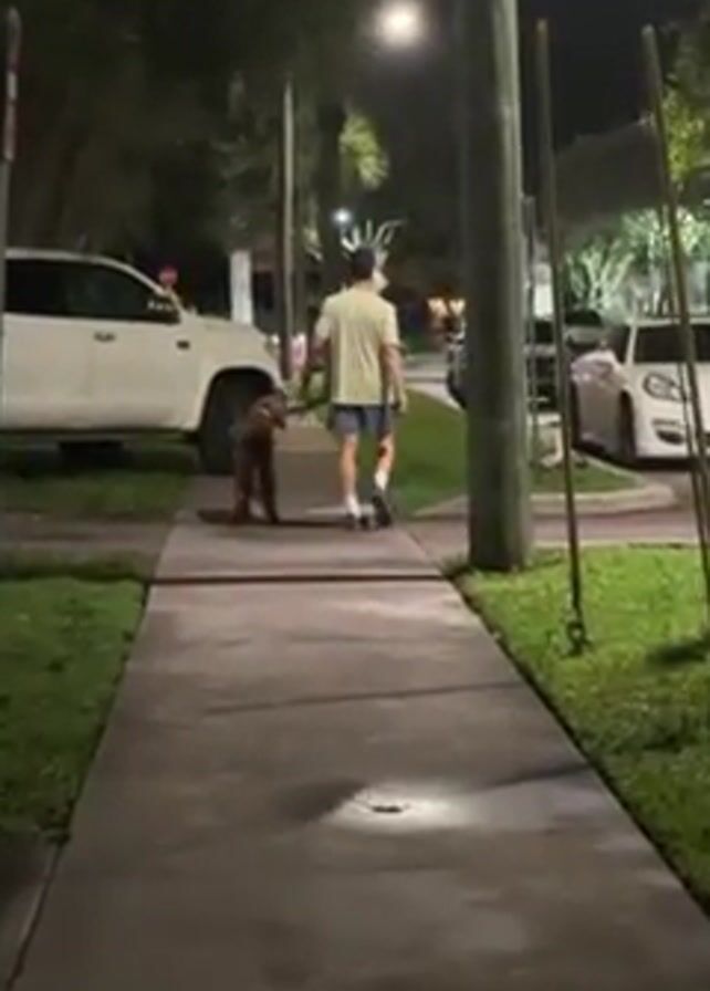 A person walks a dog on a sidewalk at night. The person is wearing a light-colored shirt and blue shorts. The dog is brown and walking on a leash. There are cars parked on the street and trees lining the sidewalk. There are also streetlights illuminating the scene.