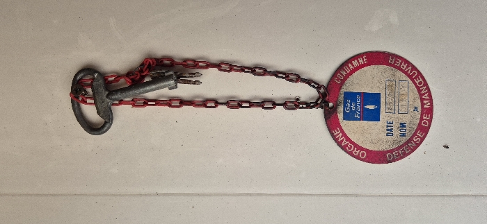 This image, taken in Wasquehal, France, displays a lockout/tagout assembly hanging vertically against a light-colored, textured background