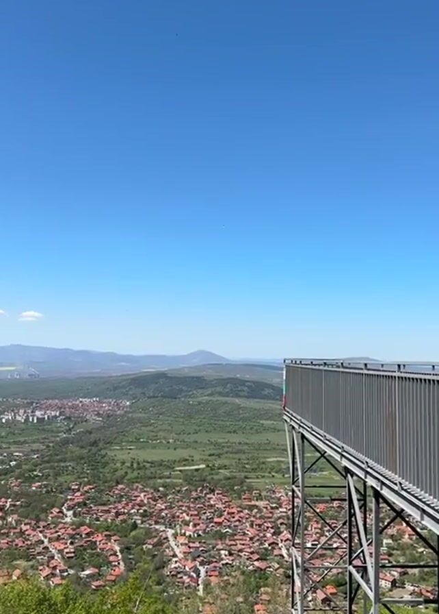 panoramic view from a high point overlooking a town and landscape. Starting from a metal observation platform, the camera pans left to reveal a town with red-roofed buildings nestled in a green valley. The background features rolling hills and distant mountains under a clear blue sky. The pan continues to show a hillside covered in trees, and ends on a large metal cross at the summit of the hill. The lighting suggests a sunny day, and the environment appears to be rural or semi-rural.