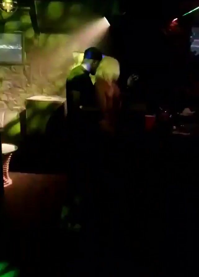 The video is shot in a dark and crowded nightclub. The lighting is colorful and appears to be coming from stage lights. Initially, a man is seen touching a woman's buttocks. He is wearing a dark shirt, camouflage shorts, and white sneakers. The woman is wearing a bikini-style outfit and bright pink platform heels. They are standing near a small round table with drinks and a partially visible person sitting. Later, the camera pans around the room showing other people milling about near the table.