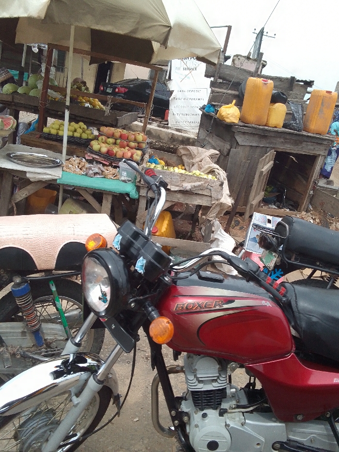This image depicts an outdoor market scene in Zango-ndaji, Nigeria, under an overcast sky. In the immediate foreground, a red and black "BOXER" brand motorcycle is parked facing right, displaying a black headlight, orange turn signals, chrome handlebars, and a silver engine block. To its left, the rear section of a second motorcycle with blue shock absorbers and a brown/pink patterned seat is partially visible. The midground features multiple makeshift market stalls constructed from rough wooden planks. The leftmost stall, partially shaded by a light-colored umbrella, displays various fruits including green citrus, yellow apples, and red apples stacked in rows. A silver oval tray and what appears to be dried produce or goods are also on this stall. Further right, another wooden stall holds several large yellow plastic jerrycans and other unidentified items. A white sign with blue text, partially obscured, advertises "CASH POINT" and "NUS SERVICE," listing financial transactions such as "CASH DEPOSIT," "CASH WITHDRAWAL," "ACCOUNT OPEN," "D.TV SUB/SCRIPTI," and "CASH TRANSFERS." In the background, a black sedan is parked behind the market stalls. Utility poles and overhead wires are visible against the sky. A person wearing a light blue and white patterned garment is partially visible on the far right, near the stalls. The ground appears to be a mix of dirt and potentially unpaved surfaces.