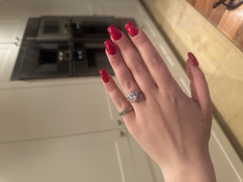 - "A hand displays red square-shaped nails and two rings, one with a large, ornate stone, the other a silver band with small, square settings" by FM-lh4BM2, licensed under CC BY 4.0