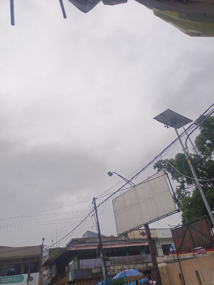 A low-angle shot shows a cloudy sky above a neighborhood. Several buildings are visible, interspersed with trees and power lines. A large, blank billboard stands out, along with a solar panel atop a tall pole. A smaller streetlight hangs above the billboard. The cloudy sky dominates the scene, creating a muted and overcast atmosphere. The scene gives the impression of an urban area in overcast weather.