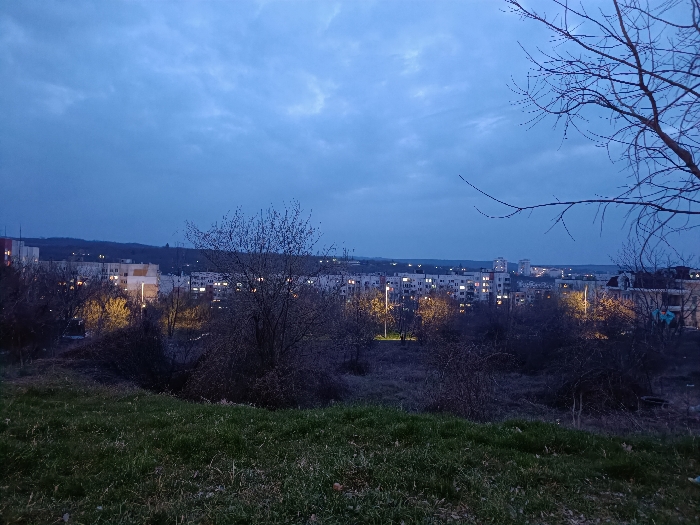 The image depicts an urban panorama of Pleven, Bulgaria, observed at dusk under a heavily overcast, dark blue sky. The viewpoint is elevated, looking down across a vegetated slope. In the immediate foreground, a dark green grassy slope occupies the lower portion of the frame. Bare tree branches, characteristic of deciduous trees in late winter or early spring, extend into the upper right corner. The mid-ground features a dense cluster of leafless shrubs and small trees, creating a dark, irregular silhouette against the illuminated cityscape. A slight depression or gully runs horizontally through the mid-ground, partially obscured by vegetation. The background presents a sprawling residential area dominated by multi-story apartment buildings, with lights visible in numerous windows. Several streetlights, emitting a warm yellow-orange glow, punctuate the scene, illuminating sections of the ground and lower tree canopies. A cluster of taller buildings is discernible in the central-right background. Distant hills are visible on the far horizon to the left, with faint points of light indicating further development. No individuals or specific actions are discernible within the frame.