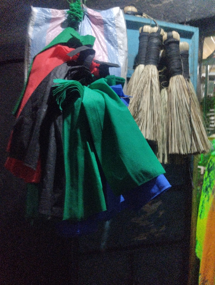 Various colorful fabrics are hung over a bundled object, with colors including red, black, green, and blue. Adjacent to the fabrics are several brooms with dark-wrapped handles and straw bristles. The brooms are neatly arranged, and behind them, a turquoise-colored structure is visible. The scene is dimly lit, creating a somewhat dark atmosphere. The composition suggests a storage or display of household items and textiles.